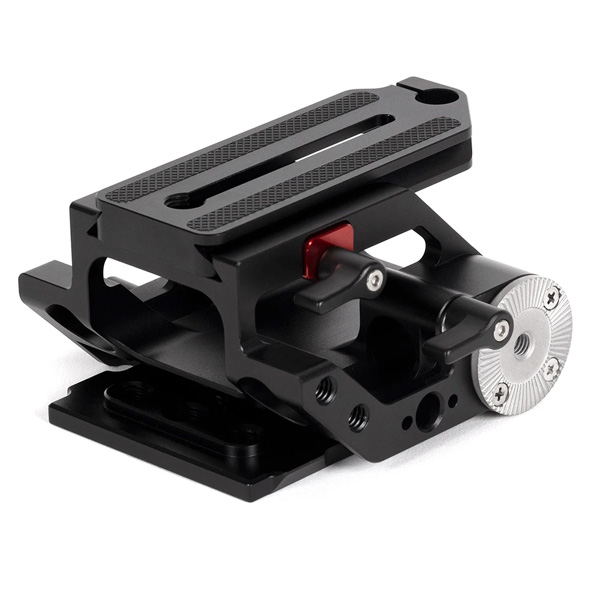 La base plate comprend une dovetail standard ARCA Swiss avec vis centrale et un système de support de lentille vertical. Fixez une vis 1 / 4-20 et 3 / 8-16 en bas de la caméra et positionnez verticalement, un rod 1 / 4-20 sous l’adaptateur d’objectif comme le Canon RF à PL Mount Pro dédiée à RED KOMODO).