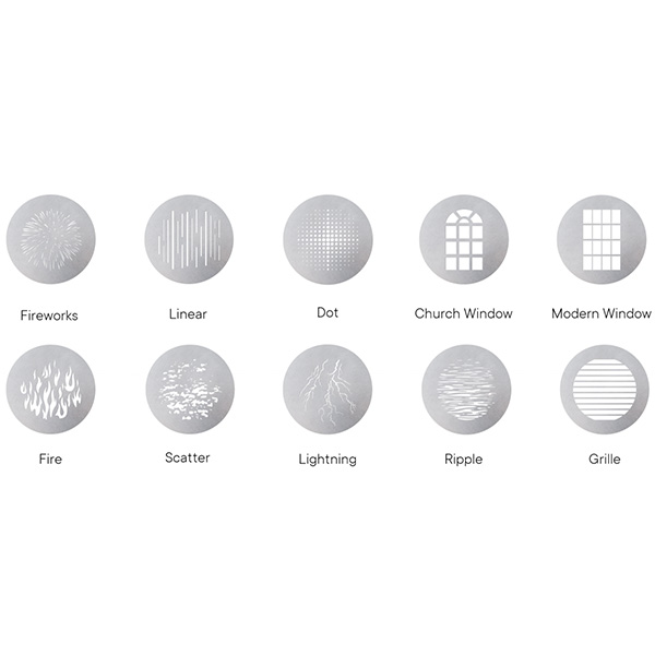 Le Aputure 10 Gobo Kit intègre dix formes classiques pour Spotlight Mount : «Feu d’artifice», «Linéaire», «Point», «Fenêtre d’église», «Fenêtre moderne», «Feu», «Scatter», «Lightning», «Ripple» et «Grille». Avec ces “Gobos” de taille B, les cinéastes peuvent facilement ajouter des designs plus créatifs à leur arsenal Spotlight Mount.