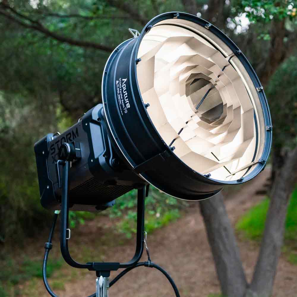 Le STORM Parallel Beam 70 d’Aputure est un modificateur optique professionnel de 70 cm, conçu pour projeter une lumière dure et ultra concentrée sur de longues distances. Grâce à son angle de diffusion extrêmement étroit de 5°, il est parfaitement adapté aux besoins des productions cherchant une source lumineuse intense et dirigée, que ce soit en studio ou sur plateau.