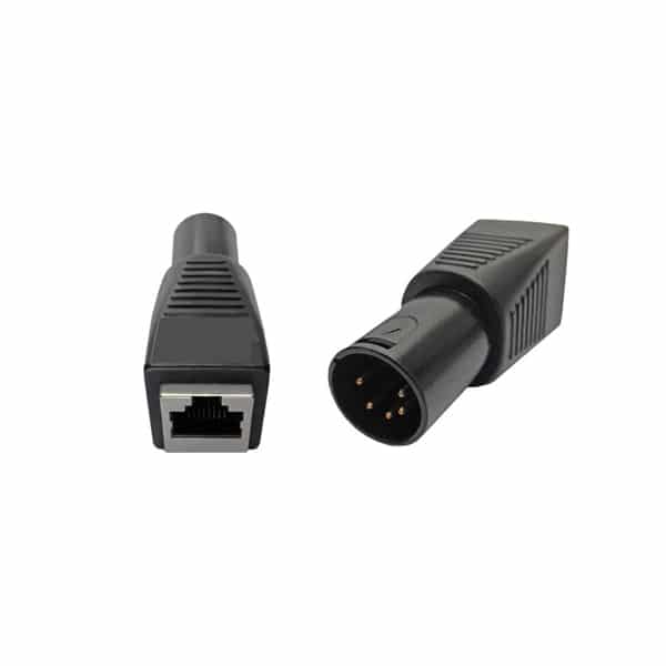 Le Quasar Science Connecteur Male DMX-5 Vers RJ45 permet de brancher les lumières Quasar Science directement sur une carte DMX. Il suffit de brancher le cordon CAT5 applicable sur le connecteur, puis dans votre carte DMX.
