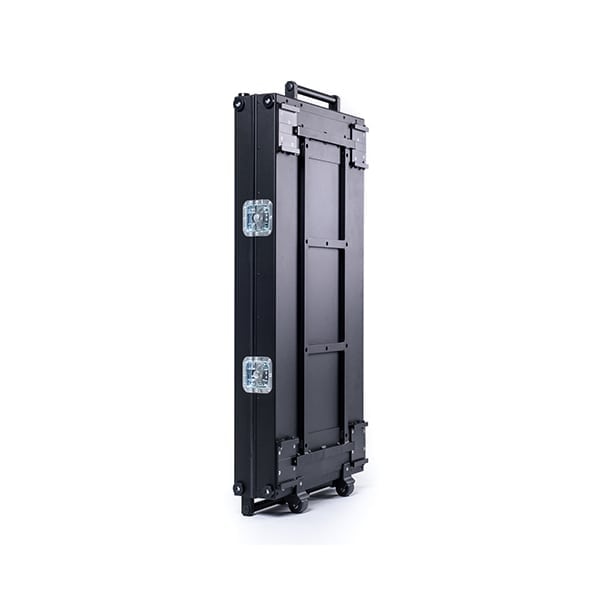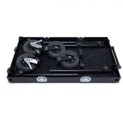 Le chariot est équipé de 4 grandes roues pneumatiques pour une manipulation aisée (225 mm de diamètre), d’un système de frein (au niveau des roues pivotantes), de 2 roues additionnelles qui facilitent le transport et de 2 plateaux moquettés pour un déplacement sans risque de tous vos équipements.