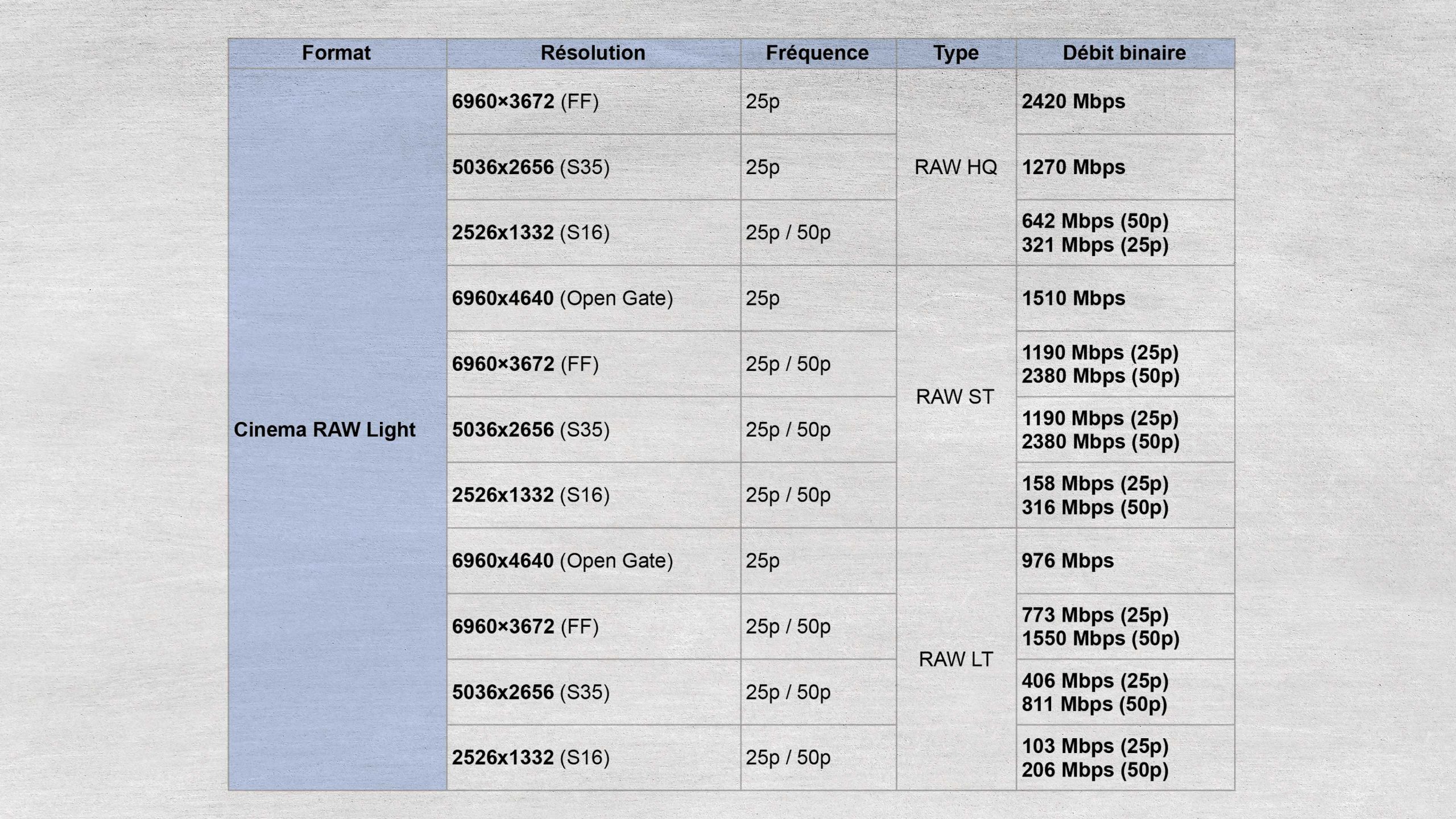 Parlons très rapidement des différents formats et débits permis par cette caméra. On commence par le Cinema RAW Light, avec 3 niveaux de compression, LT, ST et HQ pour des débits allant de 1550 à 2420 Mbps en 7K. Notez d’ailleurs qu’en Open Gate vous sereez limité à 25 images par seconde et que le RAW HQ ne sera pas disponible. Les modes Super35 et Super16 quant à eux réduisent fortement les débits.