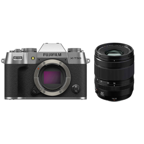 Le kit Fujifilm X-T50 avec XF 16-50 mm f/2.8-4.8 (Silver) associe l’appareil photo hybride à capteur CMOS APS-C à l’objectif grand angle XF 16-50 mm F2,8-4,8. Ce dernier est un zoom qui présente une focale équivalente à un 24 à 75 mm en plein format pouvant servir lors de reportages ou de photographie quotidienne.