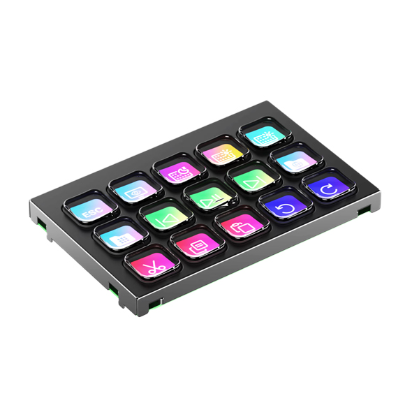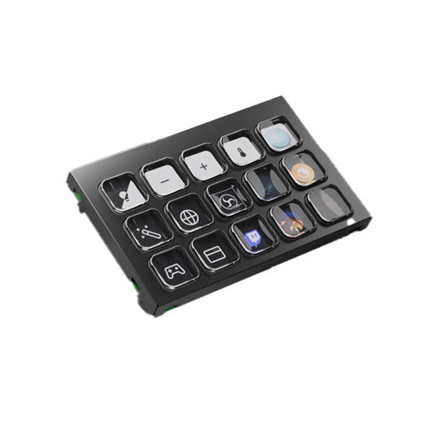 15 touches LCD personnalisables (72 × 72 px) disposées en matrice 5 × 3, pour des icônes et animations colorées.