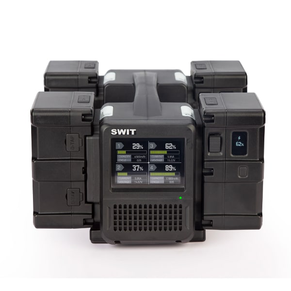 Le chargeur Swit PC-P461B (B-Mount) peut charger simultanément 4 batteries (B-Mount) à 33,6 V/3 A, 100 W par canal à une vitesse de charge ultra rapide, économisant jusqu’à 60 % de temps de charge. Il est compatible avec les batteries à monture B de 28,8 V et les batteries à monture B bi-tension de 14,4 V/28,8 V. Pour charger 4 batteries de type B de 290 Wh, le PC-P461B ne prendra que 2 heures 30 minutes pour recharger à 80 % et 3 heures 50 minutes pour recharger complètement. Il dispose d’un écran LCD couleur de 3,5 pouces pour afficher la progression de la charge, la tension de charge et les temps de cycle de la batterie. Outre les informations sur l’écran LCD, vous pouvez vérifier l’état de charge en un coup d’œil grâce aux 4 indicateurs LED situés sur le dessus du chargeur :