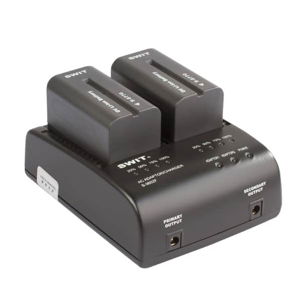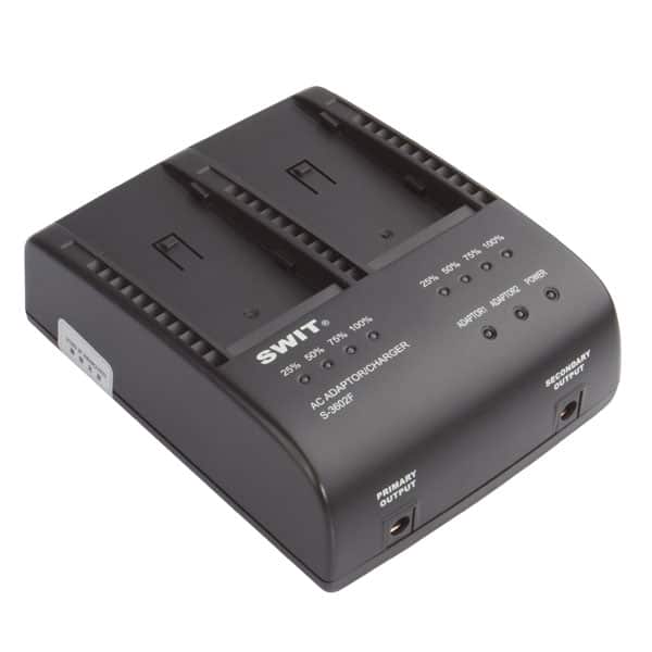 Le chargeur SWIT S-3602F dispose de deux canaux de charge avec sortie 7-8,4 VDC, 2A chacun pour charger deux batteries simultanément. Il est compatible avec les batteries SWIT S-8972/S-8970 et Sony série L. Les indicateurs de charge LED à quatre niveaux, pour chaque canal, indiquent le pourcentage de charge restant.