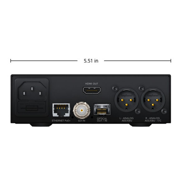 Tous les convertisseurs Teranex Mini intègrent des connecteurs de qualité professionnelle, notamment les connexions XLR professionnelles et connecteurs BNC hauts débits qui prennent en charge la haute bande passante du 12G-SDI. Tous les modèles comprennent un bloc d’alimentation continue multivolt 90V-240V et un connecteur d’alimentation conforme à la norme CEI compatible avec les câbles standard. Le port Ethernet intégré permet de contrôler le convertisseur à distance et de l’alimenter grâce au commutateur PoE.
