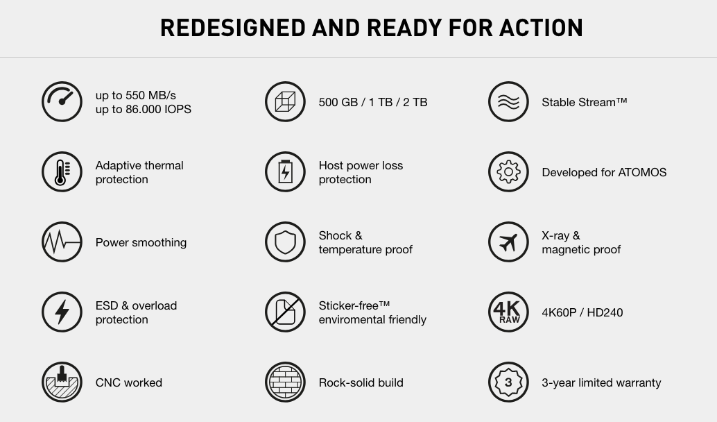 Le disque dur SSD 4KRAWATOM500 est compatible avec les enregistreurs ATOMOS 4K Shogun, Shogun Inferno, Shogun Flame, Ninja Assassin et Ninja Flame.