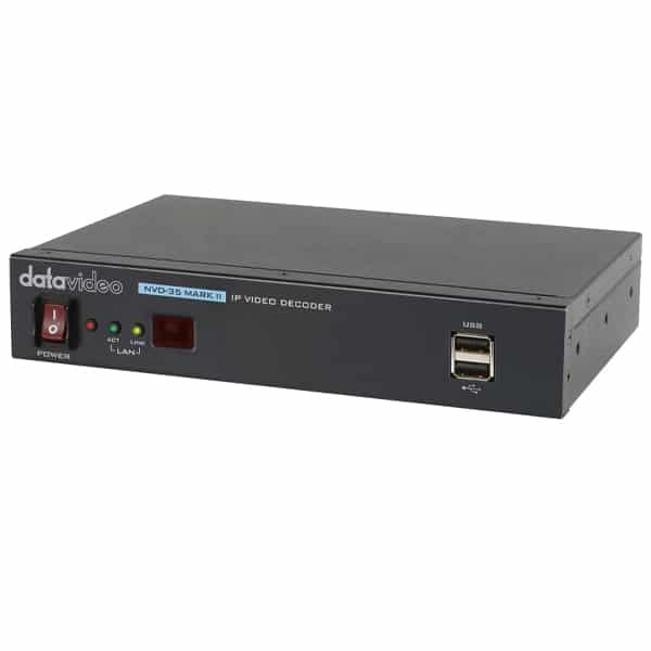 Le Datavideo NVD-35 MKII est décodeur de flux H.264 qui décode tous les protocoles de streaming courants directement à partir de YouTube Live, UStream, Dailymotion, Livestream, Twitch et d’autres CDN majeurs, et ignore toutes les publicités tierces. Il décode les protocoles SRT, RTSP, RTMP, UDP, TCP, HTTP, HLS et MPEG-TS. La nouvelle prise en charge du protocole de streaming SRT présente trois caractéristiques principales de sécurité, de fiabilité et de faible latence, ce qui permet un streaming vidéo de haute qualité avec une latence ultra-faible, même dans un environnement réseau instable. Il prend en charge la sortie vidéo SDI et composite avec des résolutions allant jusqu’à 1080p 50/60 FPS. La sortie audio RCA est également prise en charge.