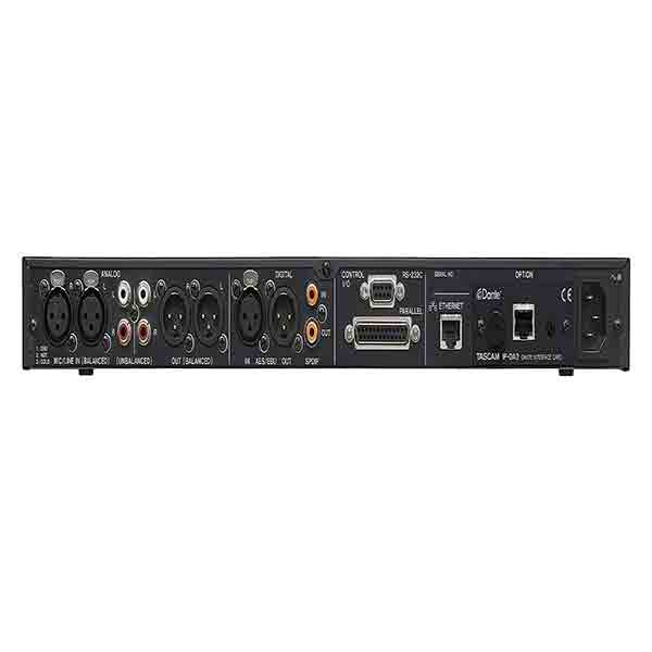 En installant une carte réseau Dante Tascam IF-DA2 (optionnelle), le SS-CDR250N s’intègre facilement dans votre réseau Dante. Cette carte prend place dans un des slots d’extension du panneau arrière, et gère deux canaux audio en extraction (Out), 2 en injection (In), jusqu’en 96 kHz / 24 bits.