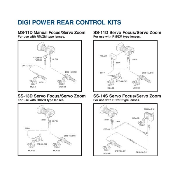 Le Fujinon SS-13DB (SS = Servo/Servo) est un kit complet de report de commande numérique pour Zoom ZK Fujinon (Cabrio). Le kit est composé de mounting clamps, câble focus, et de contrôleurs numériques de zoom et de point. Le système Fujinon SS-13D couvre la gamme complète des fonctions servo zoom / focus et peut être utilisé à la fois dans les environnements cinéma et broadcast, y compris pour les captations sportives ou live..