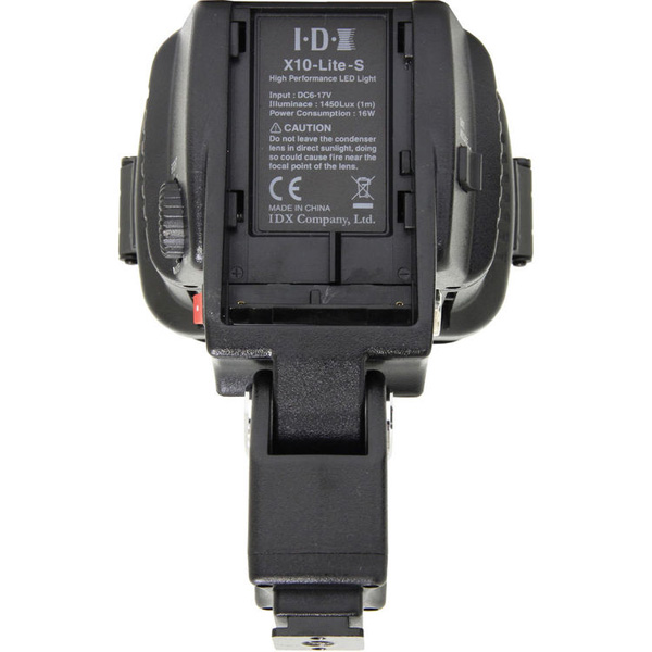 La minette LED IDX X10-Lite-S se monte sur une griffe porte-accessoires standard d’appareil photo. Elle fournit un faisceau puissant qui peut être atténué de 100 à 0% sans affecter la qualité du faisceau. Les LEDs de la minette sont conçues pour durer jusqu’à 50 000 heures. Elle est alimentée par des batteries Sony NP-F970 (non fournies). Vous pouvez également alimenter la minette LED à partir d’une source CC de 6 à 17 volts à l’aide du connecteur D-Tap fourni.