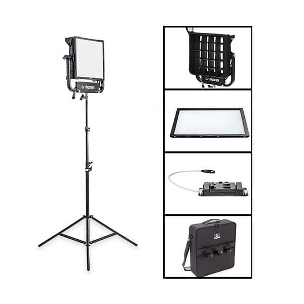 Découvrez le Gemini 1×1 Pro Kit fourni avec valise de transport, support de batterie V-Mount, intensificateur et snapgrid DOP Choice 40°.