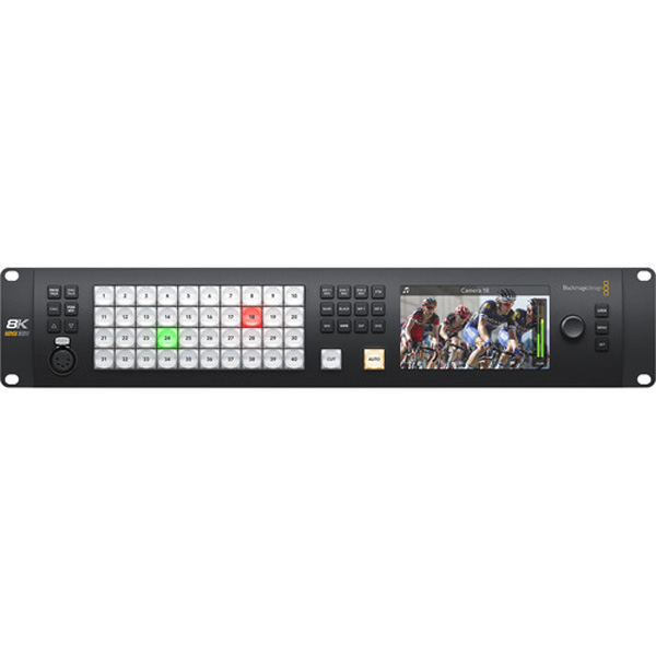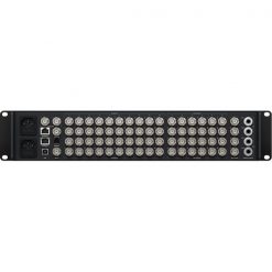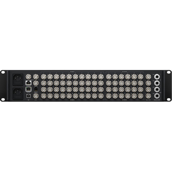 L’écran LCD relativement grand situé à l’avant de l’appareil affiche la vidéo en entrée avec une étiquette du numéro entré. Vous pouvez contrôler le Constellation 8K localement via les boutons du panneau avant ou utiliser le connecteur Ethernet intégré pour contrôler le système à partir d’un ordinateur à l’aide du logiciel fourni. Le mélangeur audio Fairlight intégré prend en charge 80 canaux d’audio provenant des entrées SDI, ainsi que 64 canaux via l’entrée MADI. La fonctionnalité de conversation est disponible via la XLR à 5 broches à l’avant de l’unité ou le connecteur RJ12 à l’arrière.