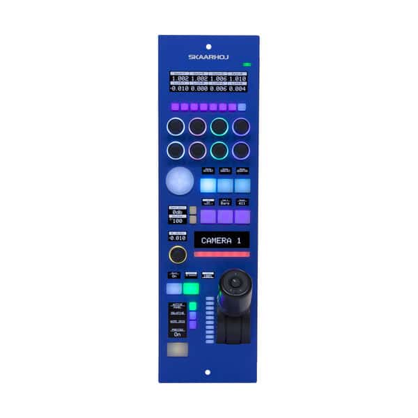 Le Skaarhoj RCPv2 avec Joystick est un panneau de contrôle de caméra à distance polyvalent et programmable. Il peut s’insérer dans un rack ou se poser sur une table. Il intègre un joystick à iris classique avec un écran et une barre LED ainsi que des knobs d’encodeur, un joystick pad, des écrans OLED, un bouton de prévisualisation, des boutons à quatre voies et un bouton Master. Le RCPv2 exécute le système d’exploitation open source UniSketch développé par SKAARHOJ, qui est programmable par l’utilisateur pour s’adapter à des flux de travail spécifiques. La technologie PoE simplifie la configuration en permettant aux signaux et à l’alimentation de circuler via un seul câble.