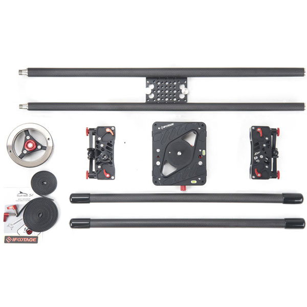 Le iFootage Shark Slider S1 Bundle est un slider conçu en fibre de carbone qui mesure 1350mm et dispose d’une longueur de travail de 1200mm grâce à ses bras d’extension supplémentaires. Il supporte jusqu’à 5kg et offre un mouvement en douceur grâce à des roulements silencieux durables, à des courroies synchrones et à une roue d’inertie. Cette roue garantie une accélération / décélération en douceur grâce à sa force centrifuge. Ses tubes en fibre de carbone offrent une meilleure résistance à la corrosion et permettent de gagner en légèreté. Des tubes d’extension supplémentaires en fibre de carbone iFootage sont également disponibles à l’achat et peuvent vous donner une longueur de travail maximale de 1800mm. Cela apporte une grande flexibilité ! Ce slider dispose également de pieds réglables qui s’étendent sous forme triangulaire. Cela ajoute une stabilité supplémentaire au slider. La plaque de montage présente en dessous du slider est également conçue dans un souci de stabilité. Elle est vissée aux quatre coins afin de minimiser les vibrations lorsque le slider est monté sur un trépied. D’autres accessoire sont disponibles, tels que les contrôleurs de mouvement sans fil S1A1 et S1A3, ainsi que le Motion X2 qui fournit un mouvement de caméra à 360°.
