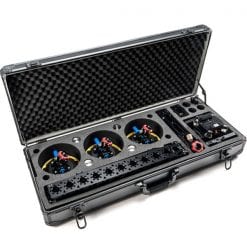 Le système complet se compose de quatre plaques de montage type dovetail, une plaque de connexion dovetail, deux petites ventouses, une grande ventouse, un bras amortisseur avec mât amortisseur, une tête amortissante, une plaque de base d’alimentation pour le DJI RS 2, une double plaque de batterie V-Mount avec support bracket, un ensemble de huit contrepoids de 7,8 oz, dix serre-câbles, une ceinture de sécurité, une trousse à outils et un étui rigide étanche pour ranger et transporter le tout.